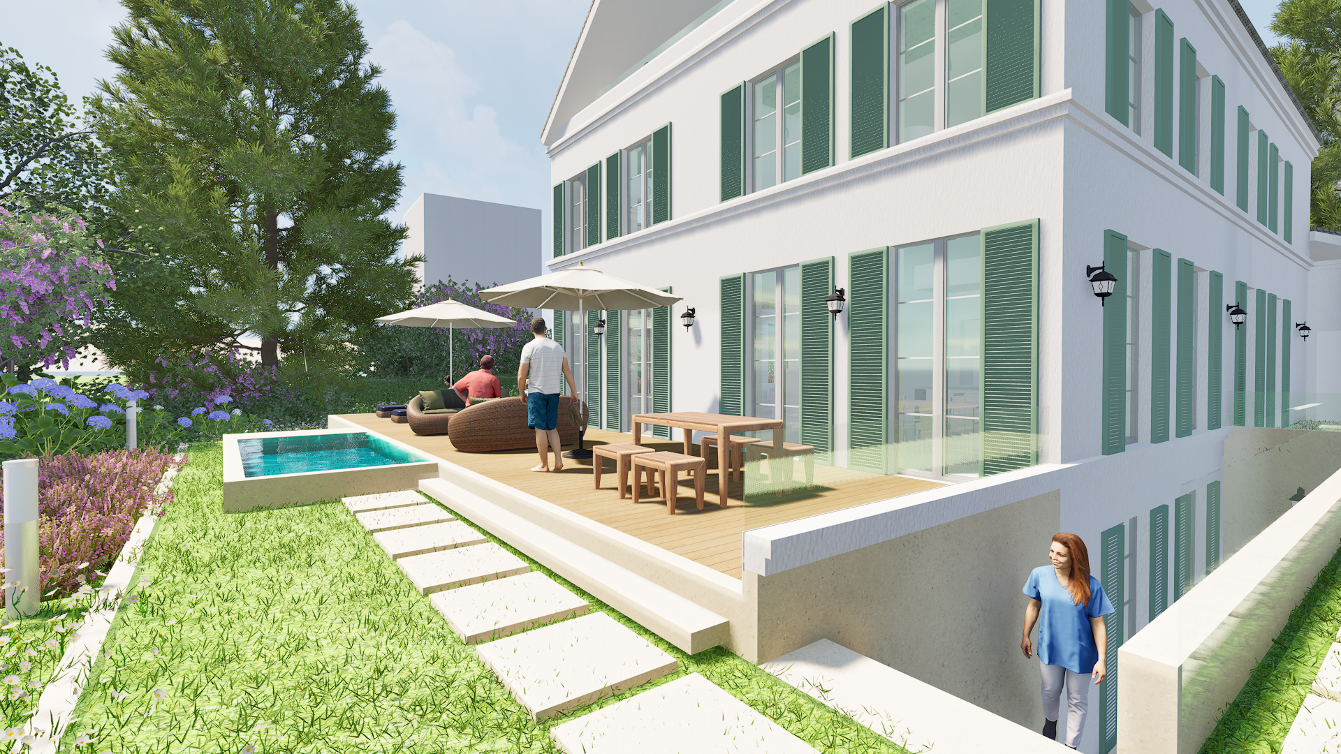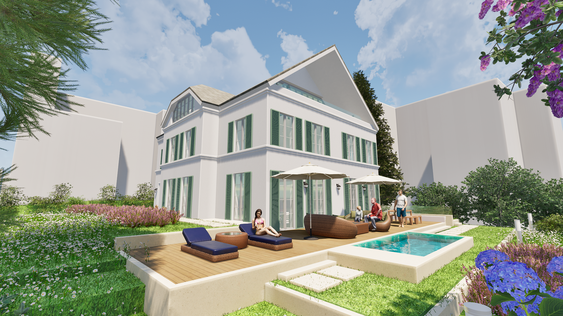 The villa is thoughtfully designed to cater to the needs of a widowed gentleman, blending functionality with comfort. The entrance and staircase are strategically positioned in the least sunny corner of the floor plan, ensuring that the sunniest side of the house is reserved for the dining area, kitchen, and living room. These spaces are designed to maximize natural light, creating a bright and welcoming atmosphere. Adjacent to these rooms is a spacious white terrace, perfect for outdoor dining, relaxation, and enjoying the sunshine. This thoughtful layout makes it delightful to spend time outdoors, especially in Frankfurt, known as one of the sunniest regions in Germany. The terrace seamlessly extends the living space, blending indoor comfort with the beauty of the outdoors.